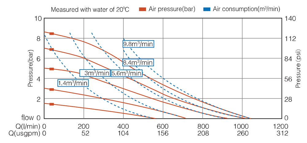 | ماكس. رفع الشفط يتغير ارتفاع الشفط مع التركيبات المختلفة لمواد الكرة والمقعد والحجاب الحاجز. | جاف 5م رطب 8م |